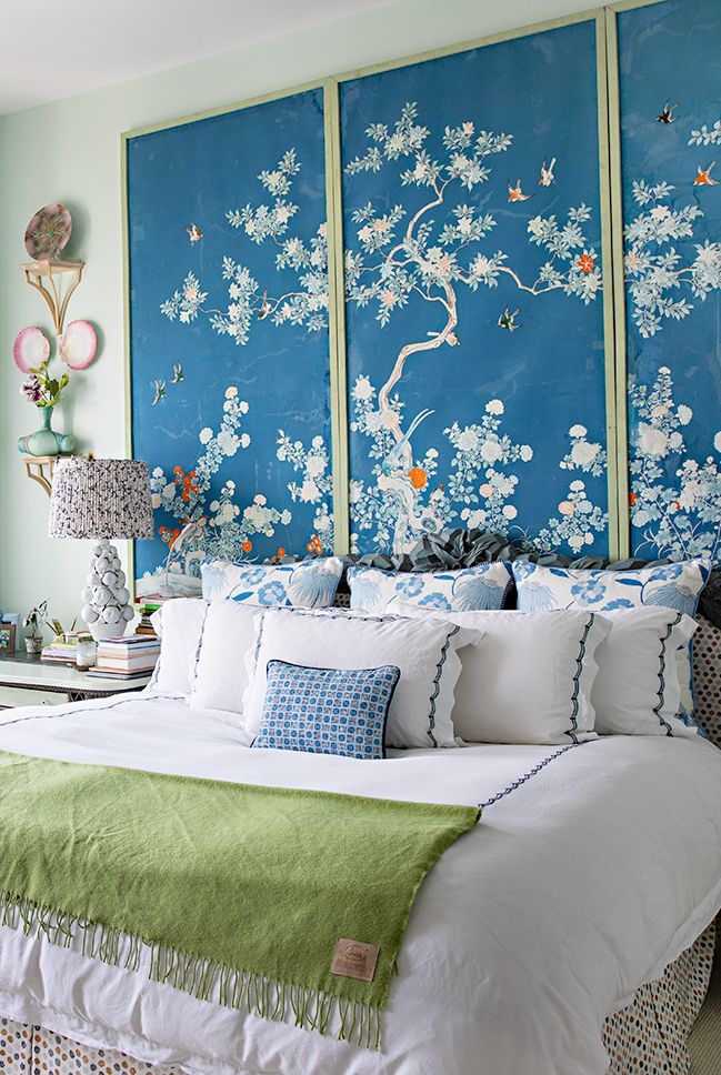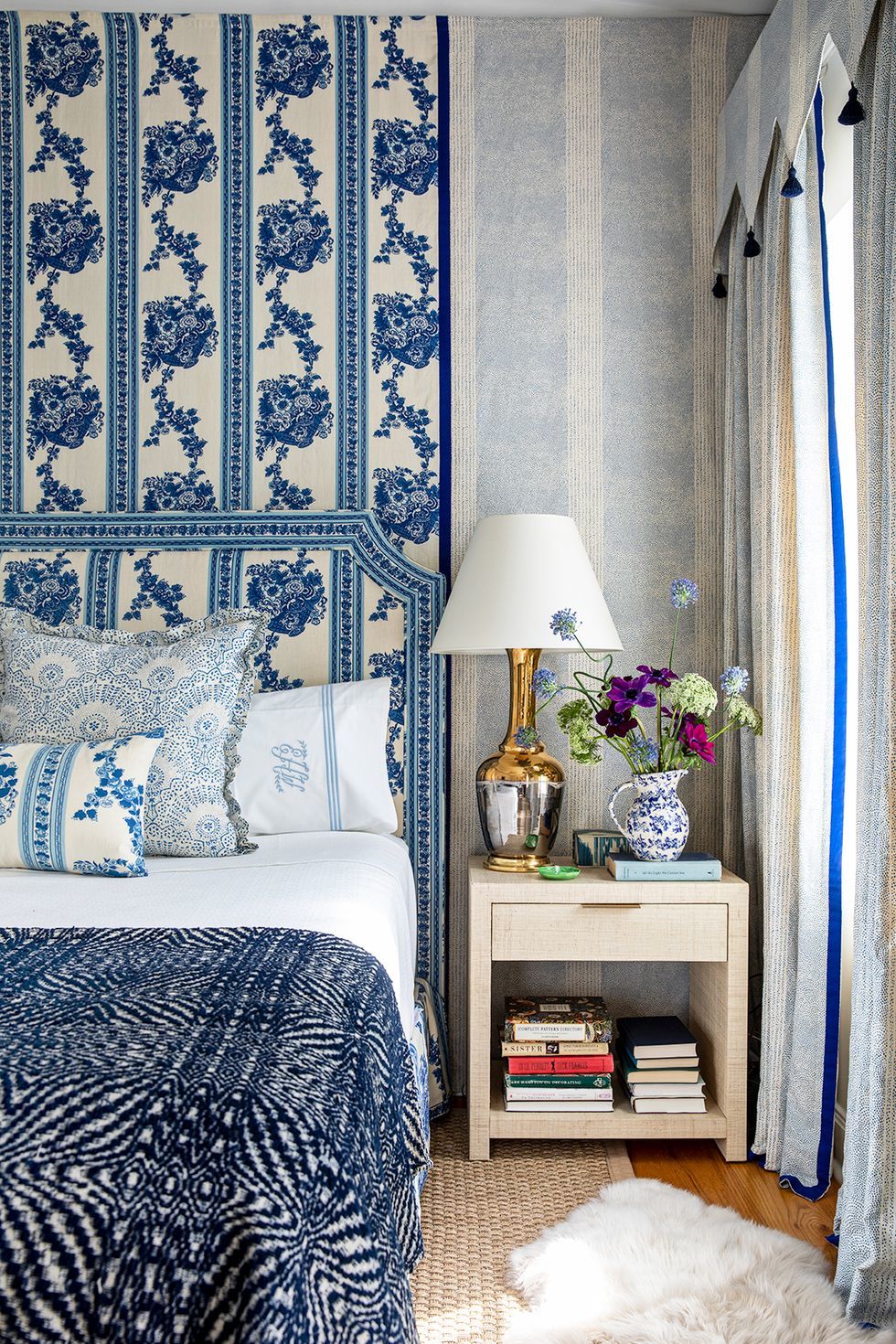 Matching an upholstered headboard to the fabric hanging behind the bed makes it feel endlessly tall and also brings in extra dimension against a different wallpaper, as Eliza Carter did here. You could also just hang a piece of affordable fabric behind the bed as a makeshift headboard.