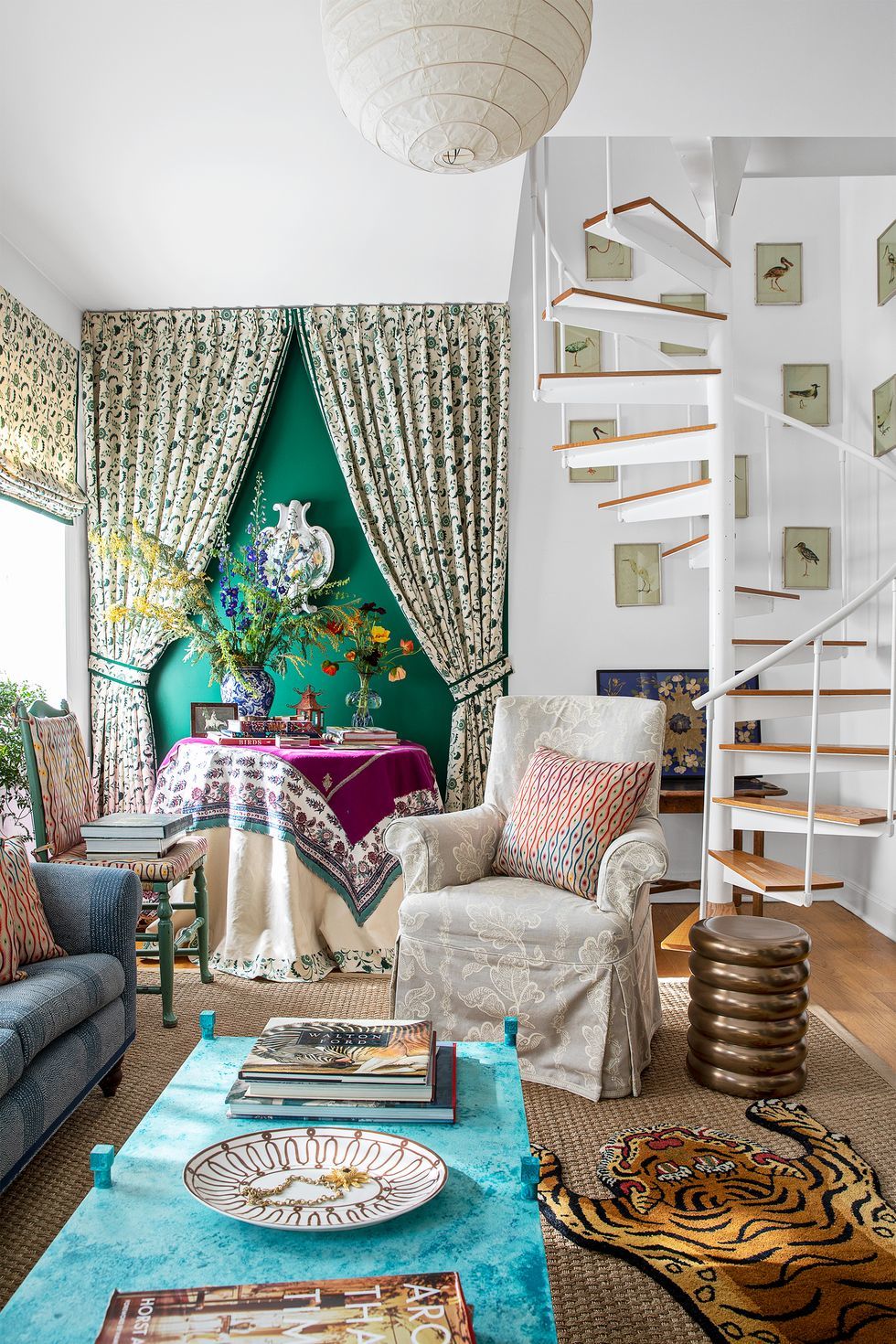 Eliza Carter hung curtains over a bright green accent wall to soften it up, accentuate high ceilings, and introduce an extra kick of pattern. The value of curtains extend beyond their use as window treatments—they can really add dimension to any wall.