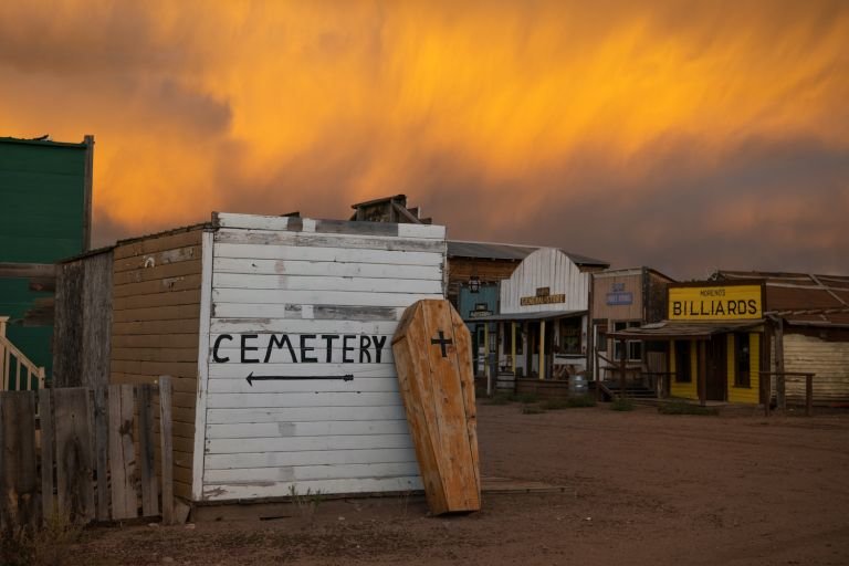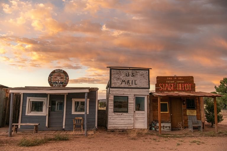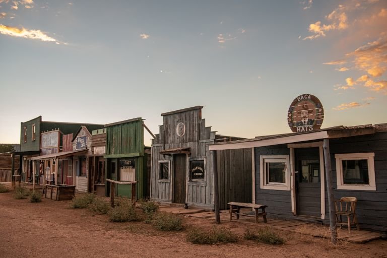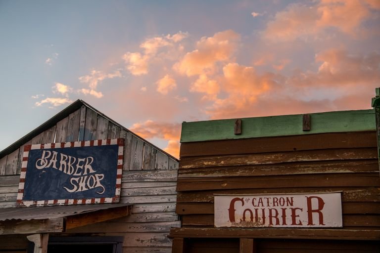 The 58 acre western style town includes a hotel and log cabin, dance hall and saloon, billiard hall, church, cemetery, jail, old-time photography studio (camera equipment not included), old-time barber shop (including an antique barber chair), and an old-time stagecoach.